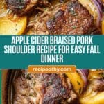 This Apple Cider Braised Pork Shoulder recipe features a tender, flavorful pork roast slowly braised in a savory apple cider and chicken stock mixture with aromatic herbs, garlic, onions, and tart apples. The pork becomes deeply caramelized from searing and melts in your mouth after hours of gentle oven braising, complemented by the sweetness and slight tartness of the apples, making it perfect for a comforting fall or winter meal.