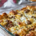 A hearty Croissant Breakfast Casserole featuring savory pork sausage, sautéed onions and spinach, layered with rich cheddar and Monterey Jack cheeses, all soaked in a flavorful egg custard and baked to golden perfection. Perfect for an easy make-ahead breakfast or brunch, this casserole combines flaky croissant bread with savory breakfast favorites for a comforting morning meal.