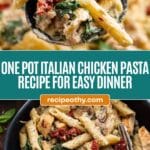 This One Pot Italian Chicken Pasta is a hearty and flavorful dish featuring tender chicken, mushrooms, spinach, and sun-dried tomatoes all cooked together with penne pasta in a creamy Parmesan-infused sauce. It’s a convenient and delicious meal perfect for weeknight dinners, combining savory Italian seasoning with creamy textures in a single skillet.