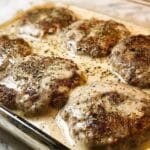 - Assemble and Bake: Pour the mushroom soup mixture over the hamburger steaks in the baking pan, covering them evenly. Cover the dish with a lid or aluminum foil to retain moisture.