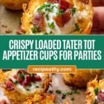 These Tater Tot Appetizer Cups are crispy, cheesy bite-sized snacks perfect for parties or a delicious appetizer. Made with frozen tater tots baked to golden perfection and filled with melted cheddar cheese, then topped with sour cream, crispy bacon, and fresh green onions, these cups are sure to be a crowd-pleaser.