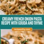 This BEST French Onion Pasta combines rich caramelized onions with creamy cheese and tender pasta for a comforting and flavorful dish inspired by classic French onion soup. The onions are slowly caramelized to develop deep sweetness, then simmered with broth, wine, and mustard before being finished with smoky gouda, parmesan, and cream for a luscious sauce.